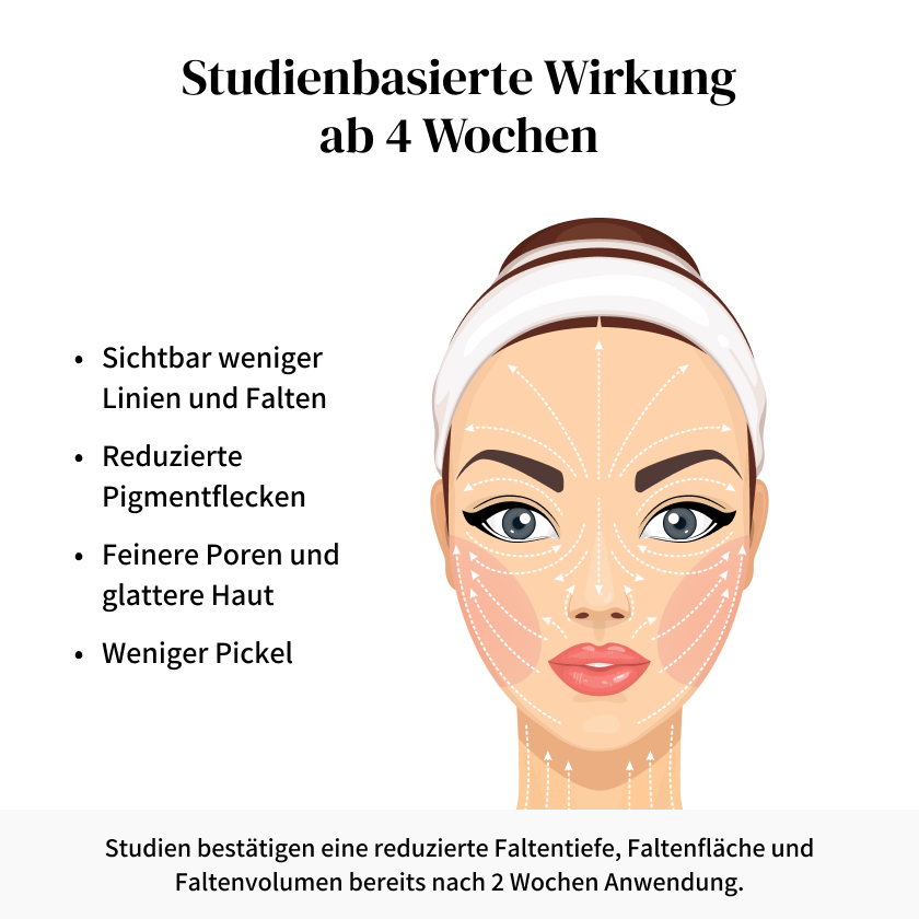 Das Retinol-Serum basiert auf besonders schonenden und weitgehend natürlichen Inhaltsstoffen und die Wirkung ist von Person zu Person unterschiedlich. Die meisten Tester:innen berichten allerdings bereits nach 4 Wochen täglicher Anwendung von einem deutlich besseren Hautbild. Zudem kam es zu einer Reduktion von Falten und einer Milderung von Pigmentflecken.