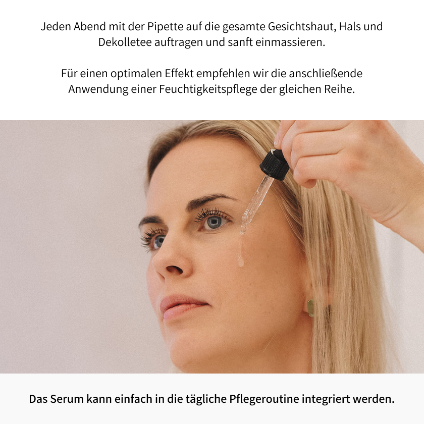 Trage abends ein paar Tropfen vom Serum auf die gereinigte Haut auf und massiere sie mit sanften Bewegungen ein. Für optimale Ergebnisse mit einer Feuchtigkeitspflege abschließen.